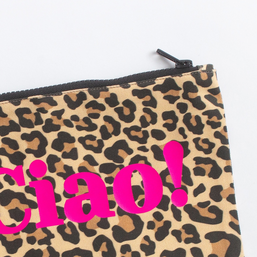 The leopard print covers the entire pouch, with the option to add contrasting zipper colors for a personalized touch. Additional customization includes logo printing, lining, and branded labels.