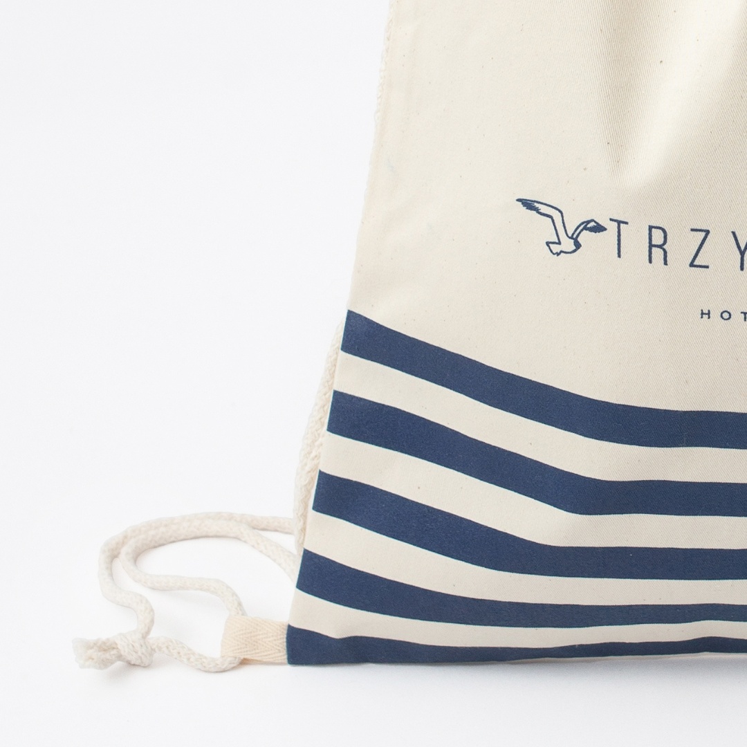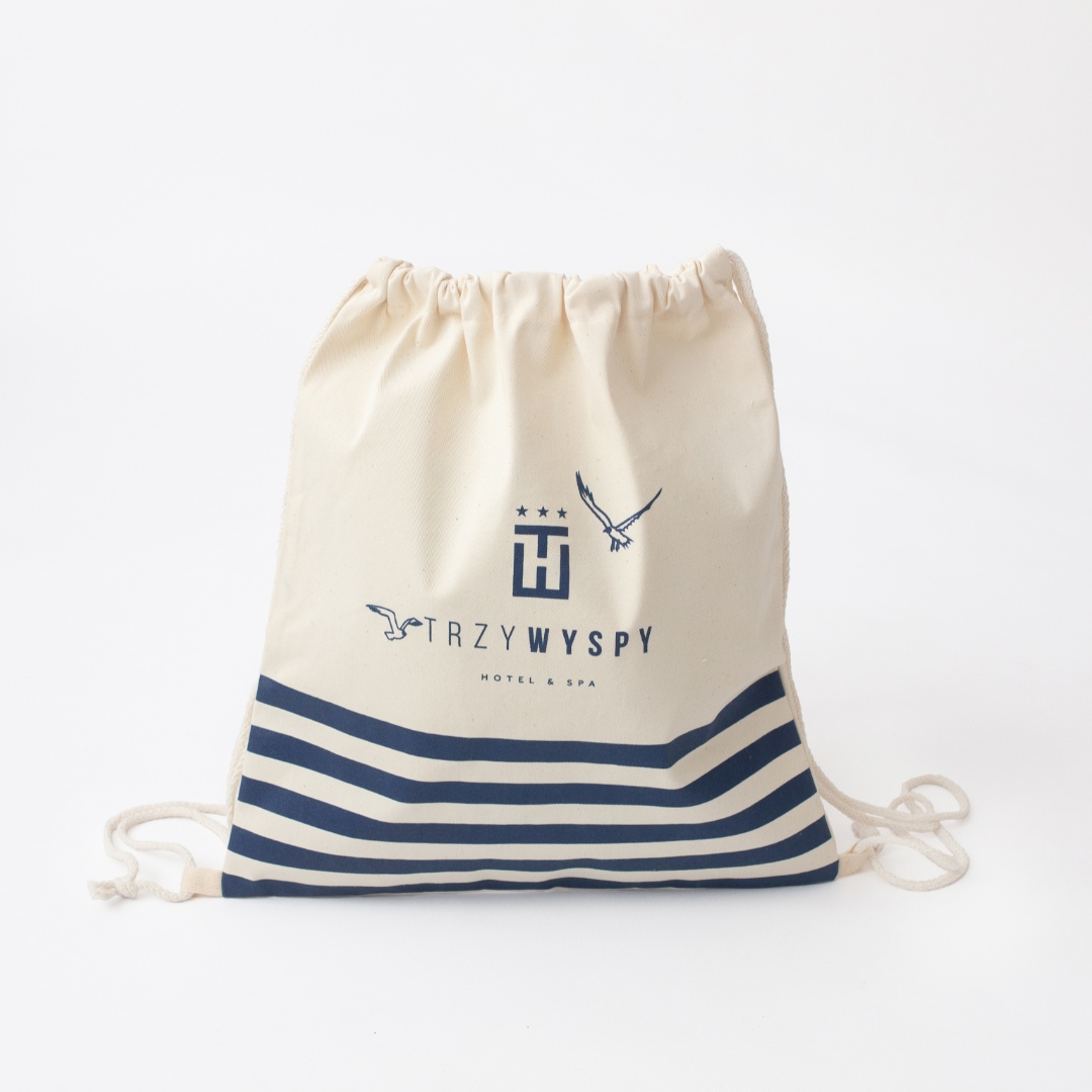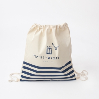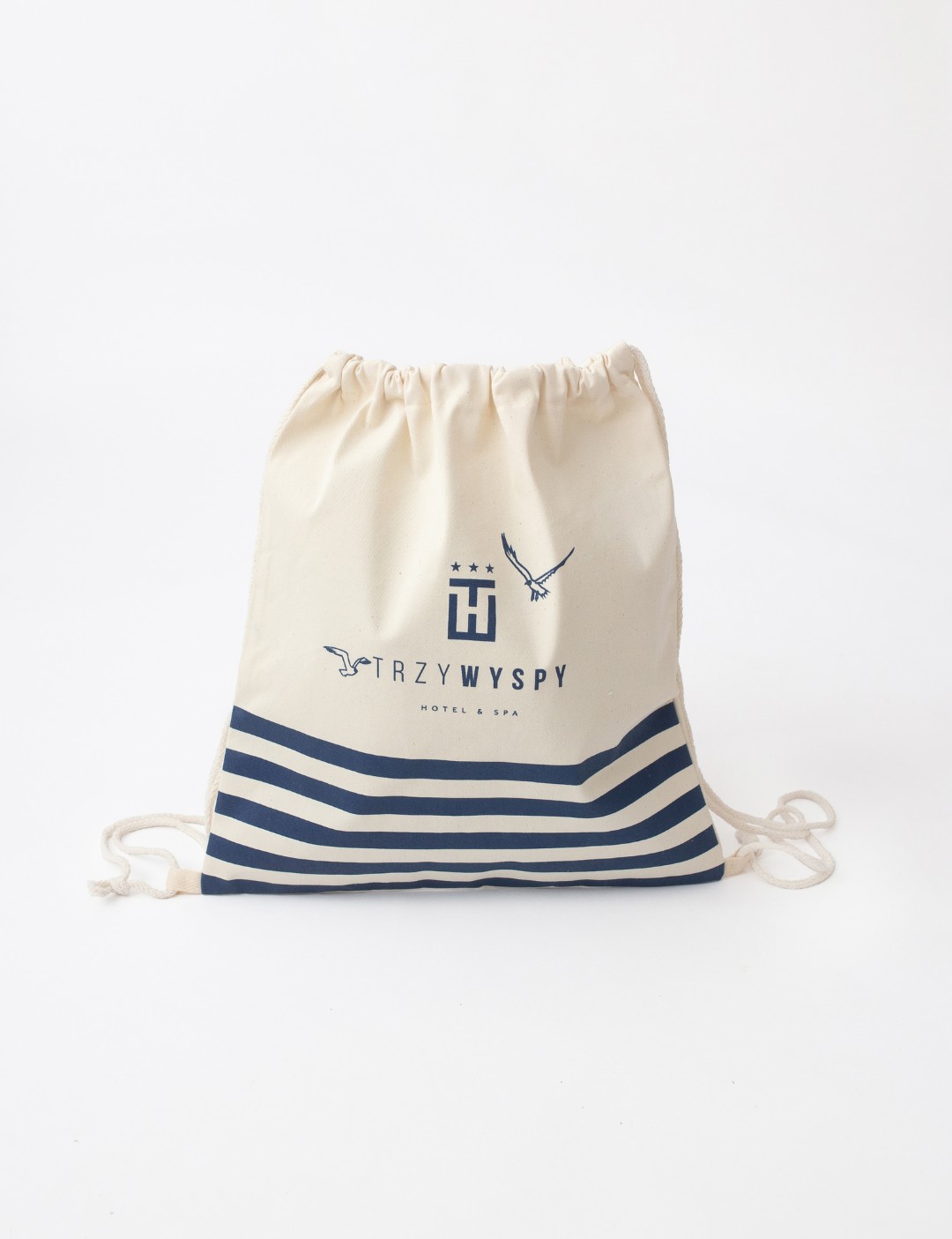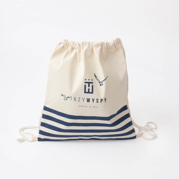 Hotel and spa Trzy Wyspy in Świnoujście created a stylish drawstring backpack made from natural canvas. The screen-printed design perfectly captures the holiday vibe and reflects the seaside character of the location.