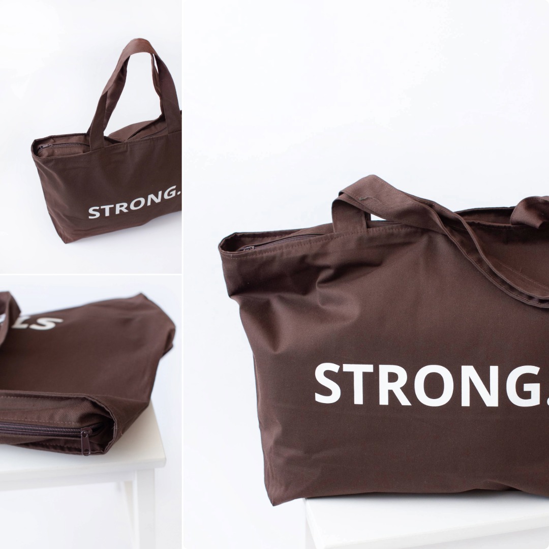 The STRONG. roomy tote is a stylish, eco-minded and effortlessly practical accessory that pairs with every look. The bold STRONG. logo celebrates the values of our incredible community of women — confident, supportive, and unapologetically powerful.