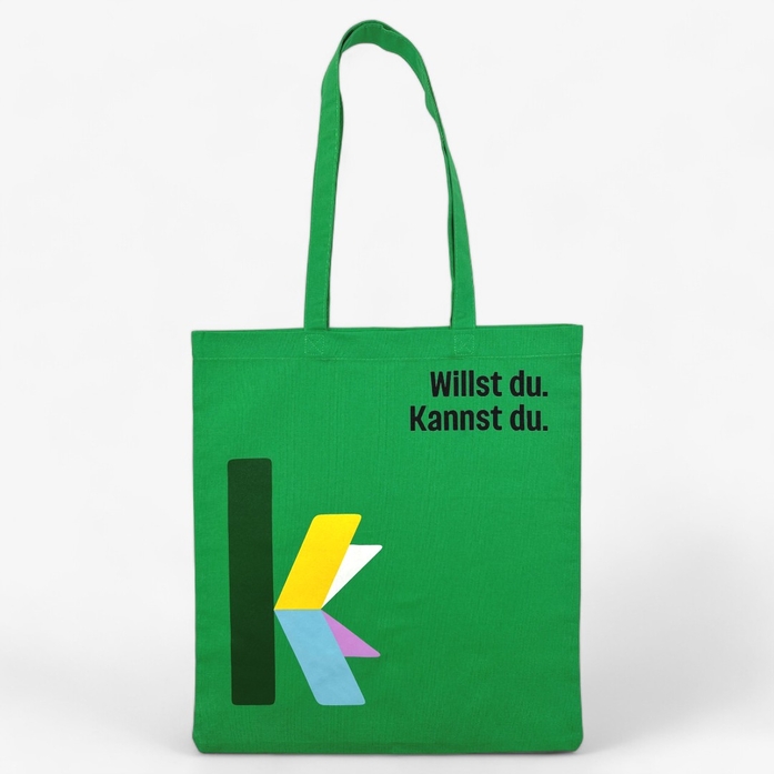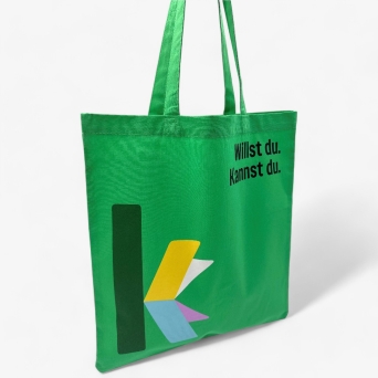 This bag is crafted from high-quality cotton in a vibrant green hue, specifically designed for the karriere.at platform. Adorned with the motivational phrase "Willst du, kannst du," it encourages action and highlights the values associated with career development.