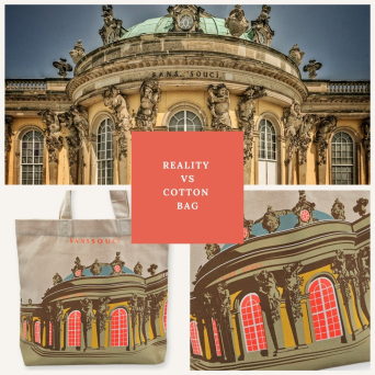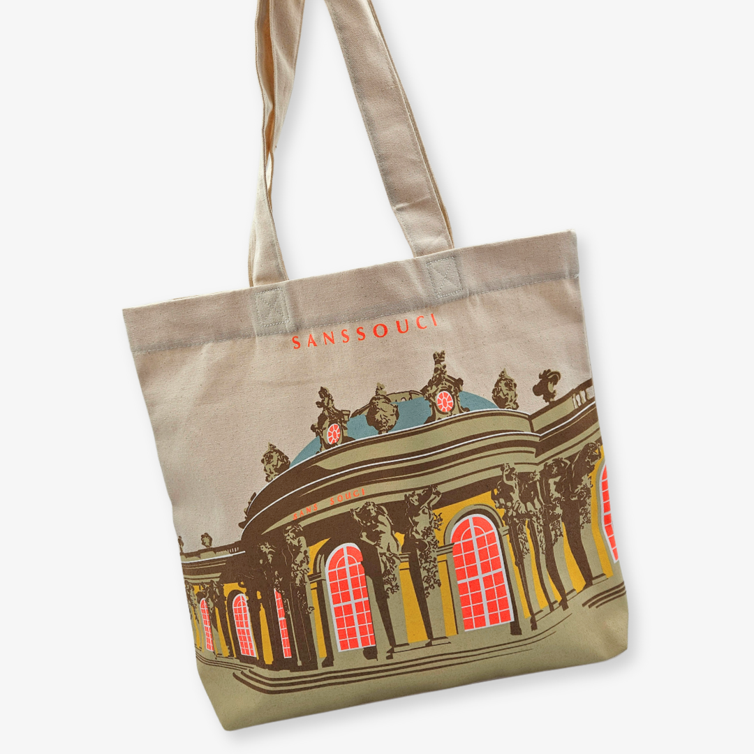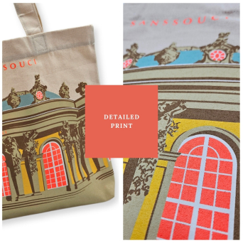 An organic cotton bag with a Sanssouci print – history doesn't have to be admired from afar; you can carry it on your shoulder! A reinforced bottom adds functionality, while the architectural motif catches the eye.